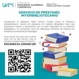 Es un servicio de préstamos de material bibliográfico físico que proporciona acceso a documentos que no están disponibles en su colección bibliográfica y se encuentran entre las bibliotecas miembros del Sistema de bibliotecas universitarias de Nicaragua.